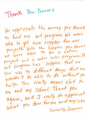 I am eternally grateful for the support of loved ones and strangers alike! It is encouraging to know that ALL the donors (you!) have reasons to contribute to a cause such as this. I am remindedthat there are people that love and appreciate the arts and know that in very many cases, a lot can be done with even a little bit. Thank you for supporting me, my students, and the program that I am developing. The supplies I have requested will help add variety to the experiences my students can have in class. I know they appreciate you too!-Ms. Perewiznyk