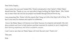 It is with much emotion that I thank you for supporting my project that has the potential to benefit every student in my school. My students will now have access to opportunities in the Library Maker Space to dream, create, learn with others, work with community experts, and share their projects. As a result of your donation, my students will have many opportunities to be college and career ready. I know they will feel pride in their accomplishments and have increased self-esteem. Thank you so much for your generosity.-Mrs. Nickel